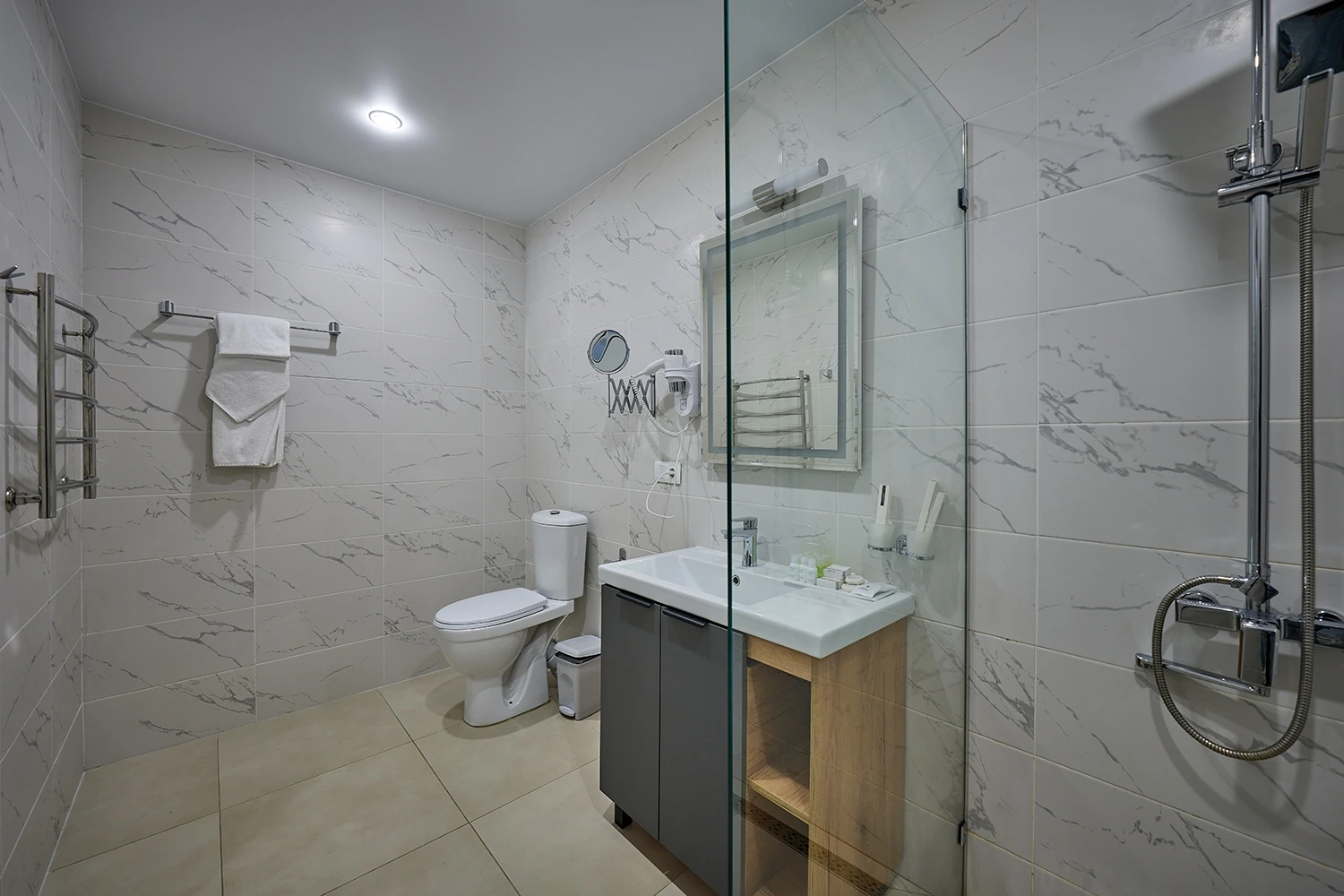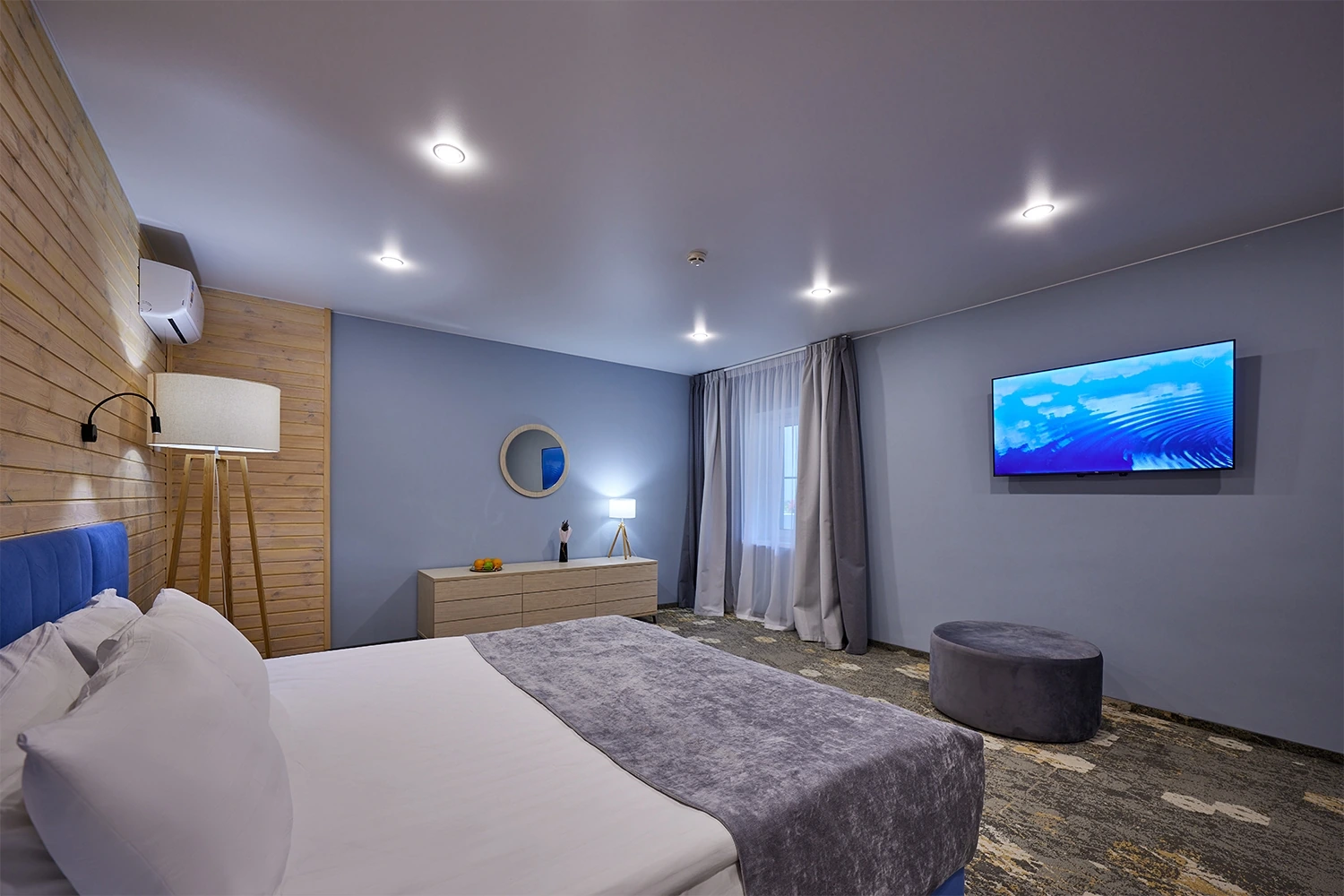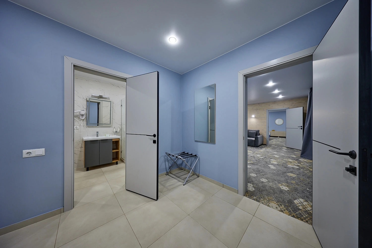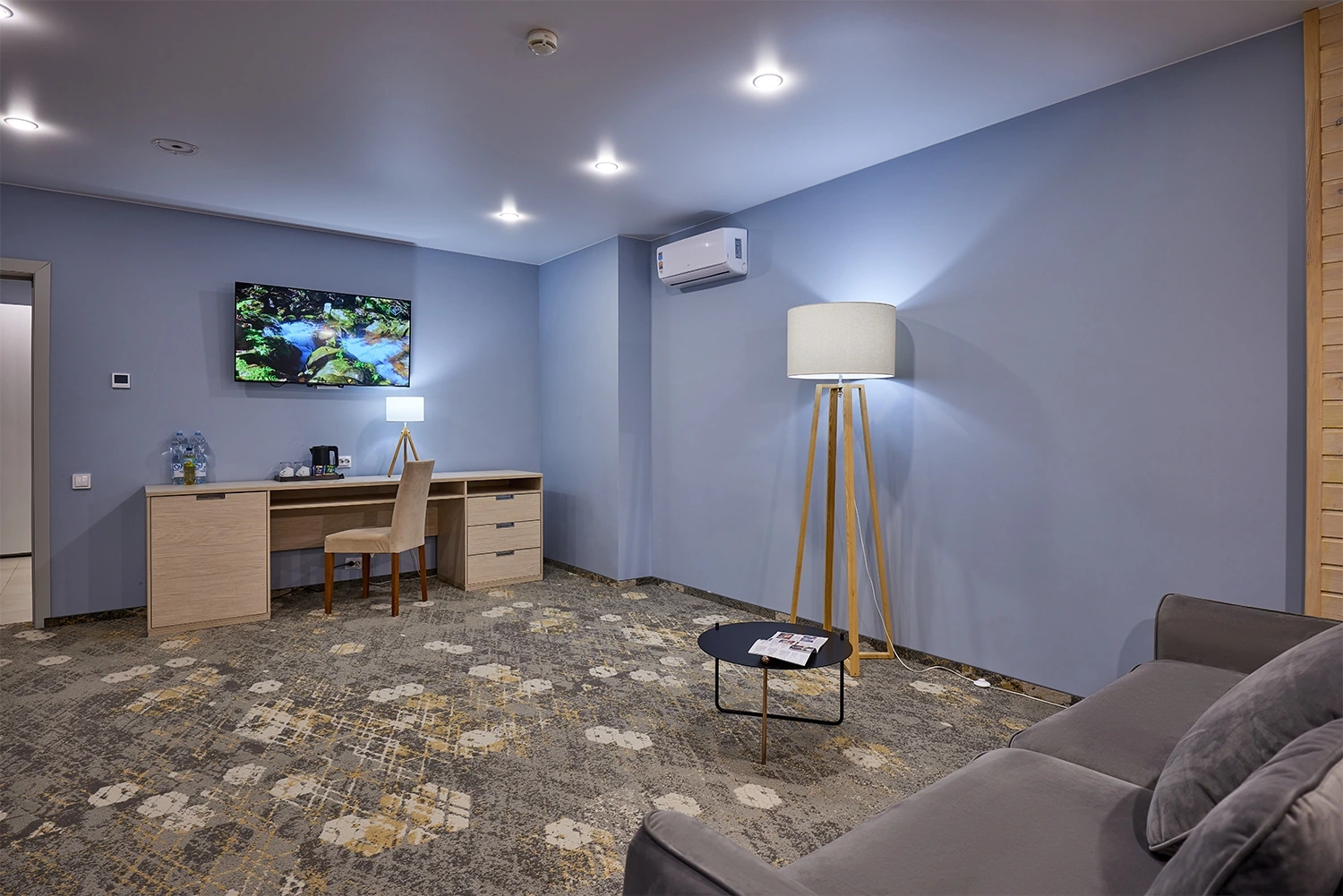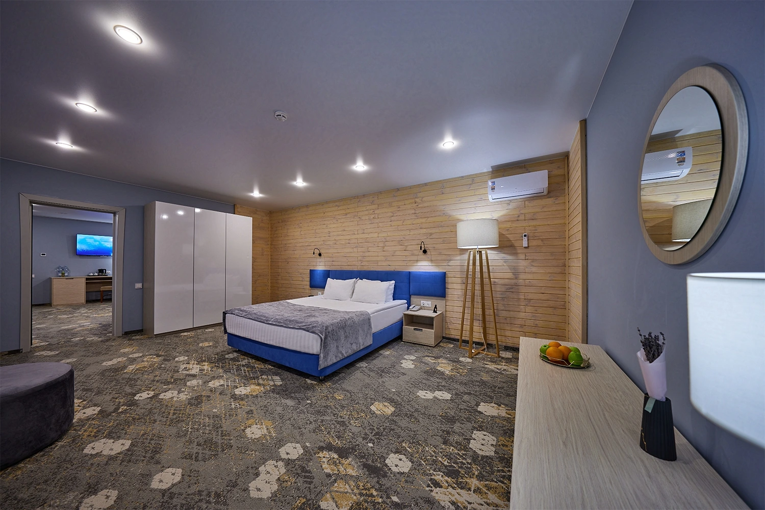 Двухкомнатный люкс в 6 корпусе — просторный номер площадью 68 кв.м., идеально подходящий для комфортного проживания 2–4 гостей. В номере есть двуспальная кровать, раскладной диван, кондиционер, мини-бар и чайная станция, что обеспечивает удобство и уют. Гости могут воспользоваться Wi-Fi, телевизором со спутниковыми каналами, а также утюгом и гладильной доской. Ванная комната оснащена душевой кабиной, теплым полом, халатами, тапочками и полным набором косметических принадлежностей.